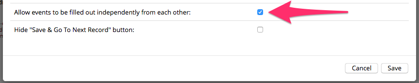 - Record Status Dashboard. Ensures the record status dashboard only reveals forms that should be accessible. It goes through each record, and disables links to all forms that are not complete or immediately following a complete form. If there are multiple events, forms are evaluated one event at a time, with the assumption *** that each event must be completed before any forms on the next event can be accessed. Continuing with the above example: if forms X, Y, and Z are designated for both a January and February event, January’s form Z must be complete before the user can fill out February X.